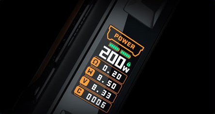 La mod è dotata di uno schermo TFT da 1,08 pollici per una chiara visualizzazione delle impostazioni, inclusi il livello di carica delle batterie, il wattaggio, il voltaggio, il valore della resistenza e il contatore dei puff.