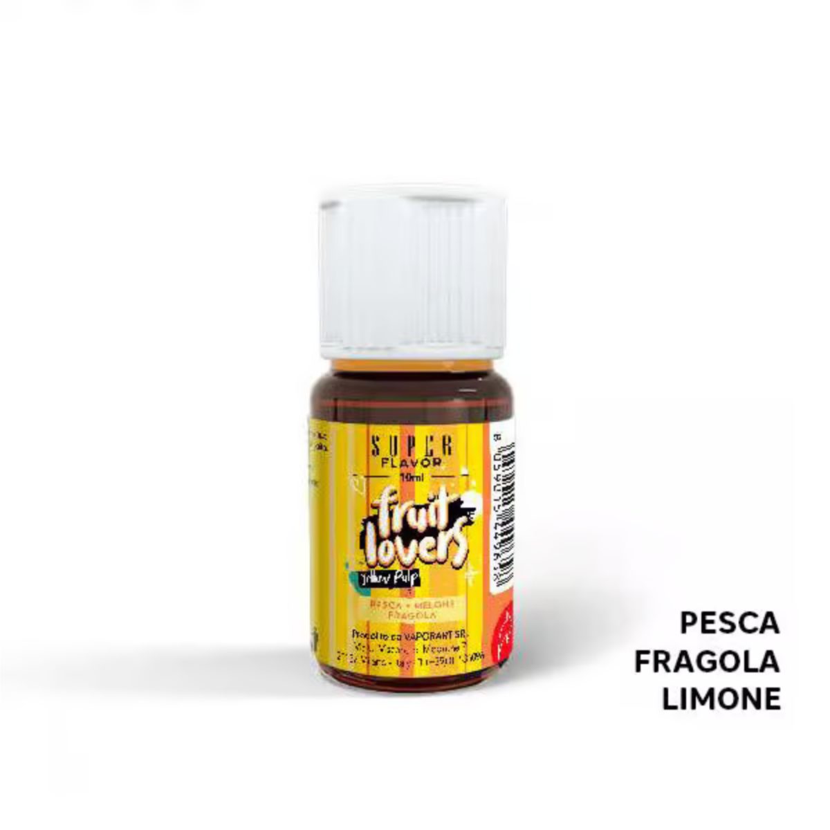 Yellow Pulp della linea Fruit Lovers di Super Flavor è un aroma concentrato da 10ml che combina il gusto della pesca con note di fragola e melone, per una miscela fruttata dal profilo dolce e bilanciato.