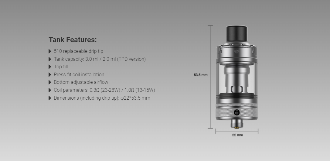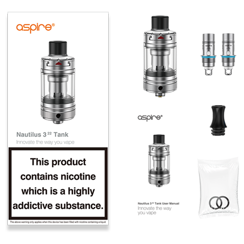 Aspire presenta il nuovo Nautilus 3²², la versione 22mm del Nautilus 3. Questo atomizzatore ha 7 diverse regolazioni per il flusso dell'aria posto in basso (3.0mm, 2.5mm, 1.8mm, 1.5mm, 1.2mm, 1.0mm, 0.8mm), la ricarica del liquido dall'alto con il childlock e la compatibilità con tutte le resistenze Nautilus. Incluse troviamo la 0,3ohm e la 1,0ohm entrambe a mesh.