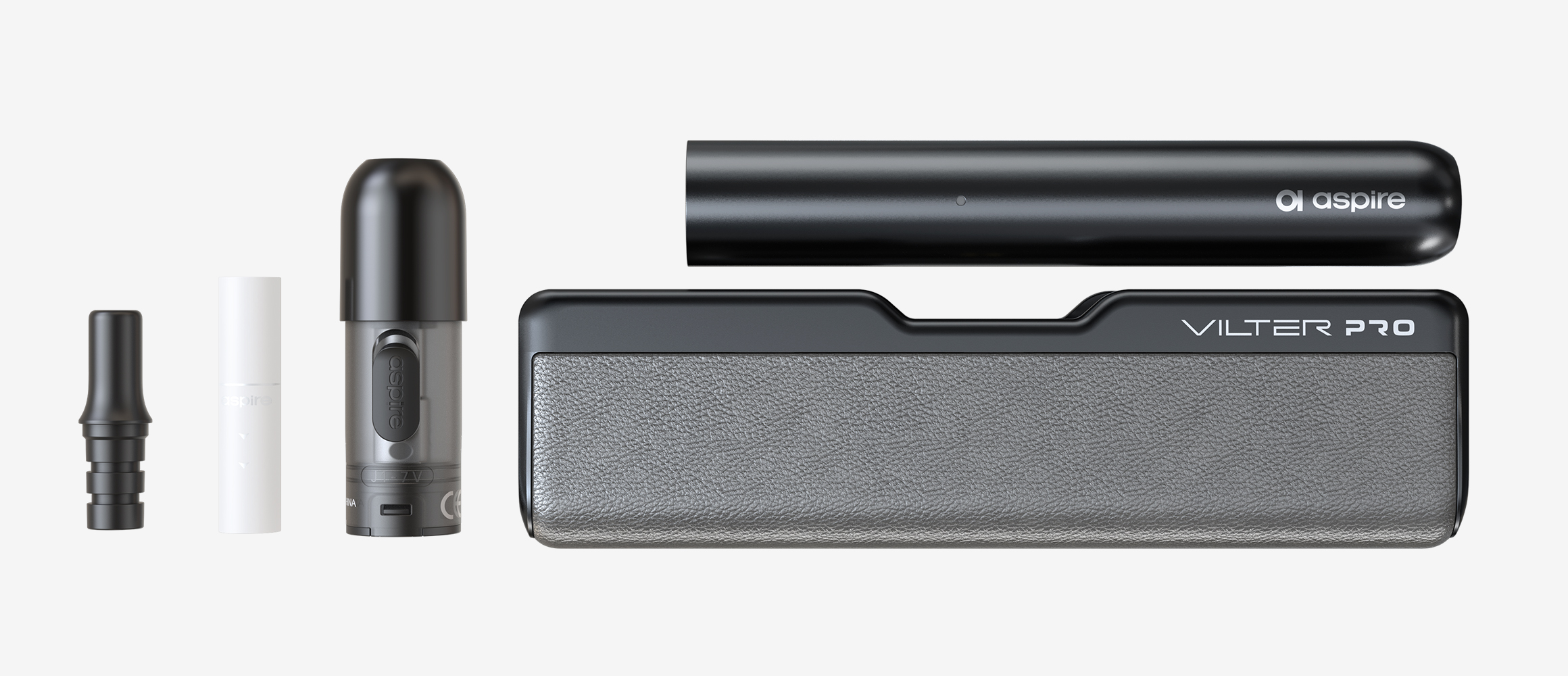 1x Vilter Pro Power Bank, 1x Vilter Pro Pen, 1x Cartuccia Vilter Pro con drip tip in POM, 3x Filtri, 1x Cavo USB-C, 1x Manuale Utente