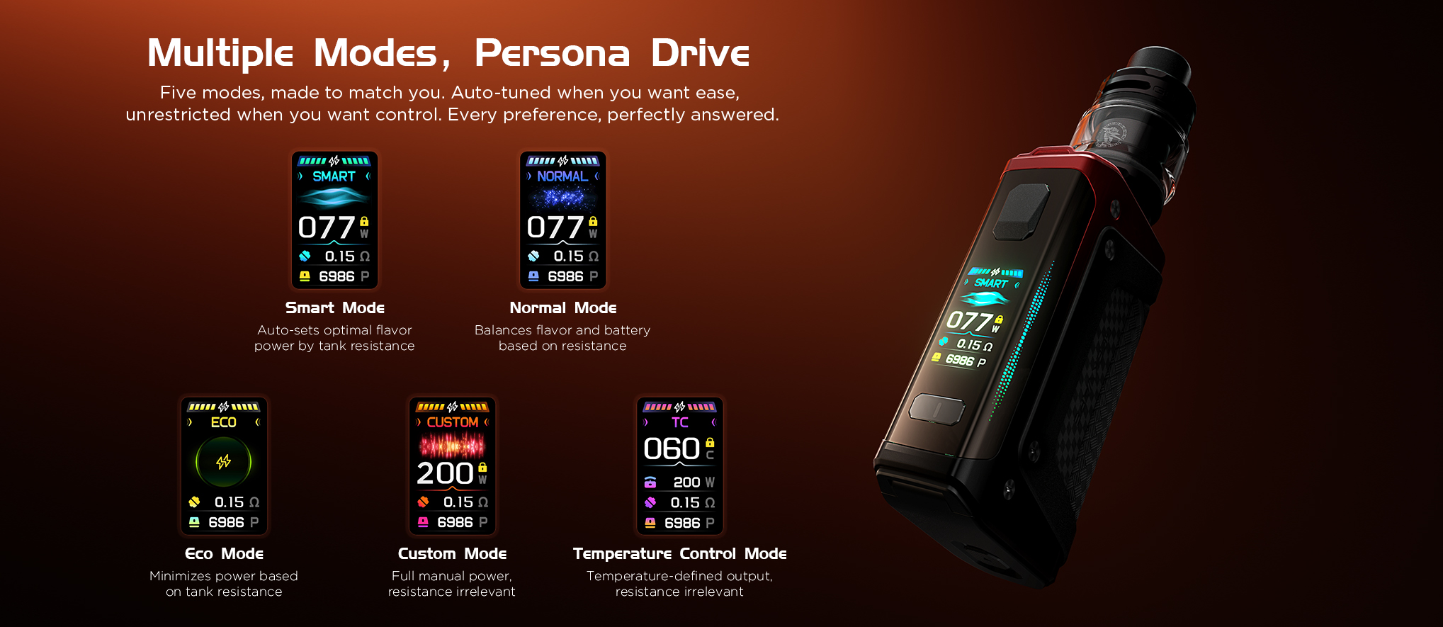 Le modalità di svapo sono selezionabili mediante il display TFT a colori da 1.08 pollici e sono le seguenti: