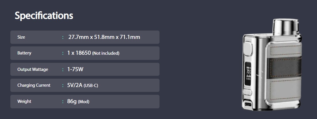 Nonostante le sue dimensioni compatte, questa box mantiene un'elevata efficienza e semplicità d'uso, con una potenza massima di 75 W. La modalità di wattaggio variabile è facilmente accessibile, rendendola ideale per utenti principianti e per chi cerca praticità. È inoltre disponibile la modalità di controllo della temperatura, compatibile con resistenze specifiche, e la funzione M1 per memorizzare le impostazioni personalizzate.