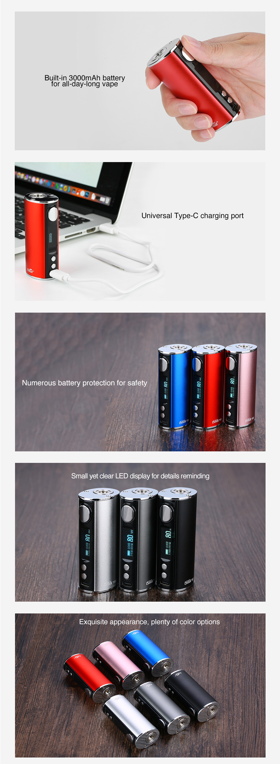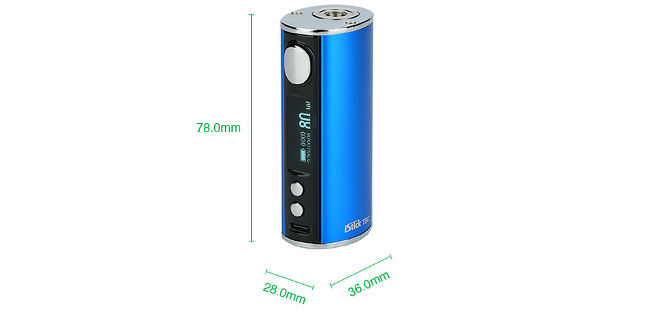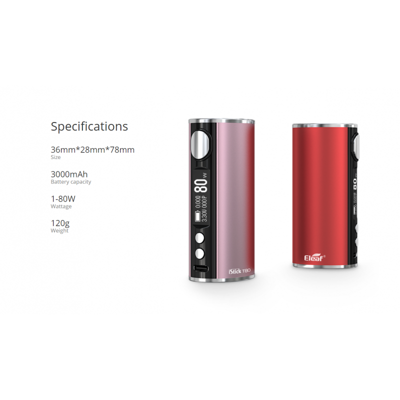 l'Eleaf iStick T80 batteria Mod con 3000mAh di batteria incorporata. La progettazione di Eleaf iStick T80 è abbastanza compatto e raffinato con una vasta gamma di colori per i vostri desideri speciali.Il display a LED è ancora più chiaro. Inoltre, supporta la ricarica per il vostro viaggio vaping tipo semplice-C.