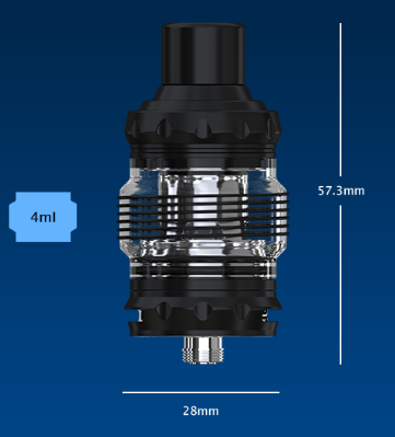 Il Melo 5 è un atomizzatore da 57,3 mm x 25 mm alla base e 28 mm al massimo con il suo vetro convesso per un peso di 65,5 g. Progettato in acciaio inossidabile e vetro Pyrex protetto da strisce di silicone, ha una capacità di 4 ml.