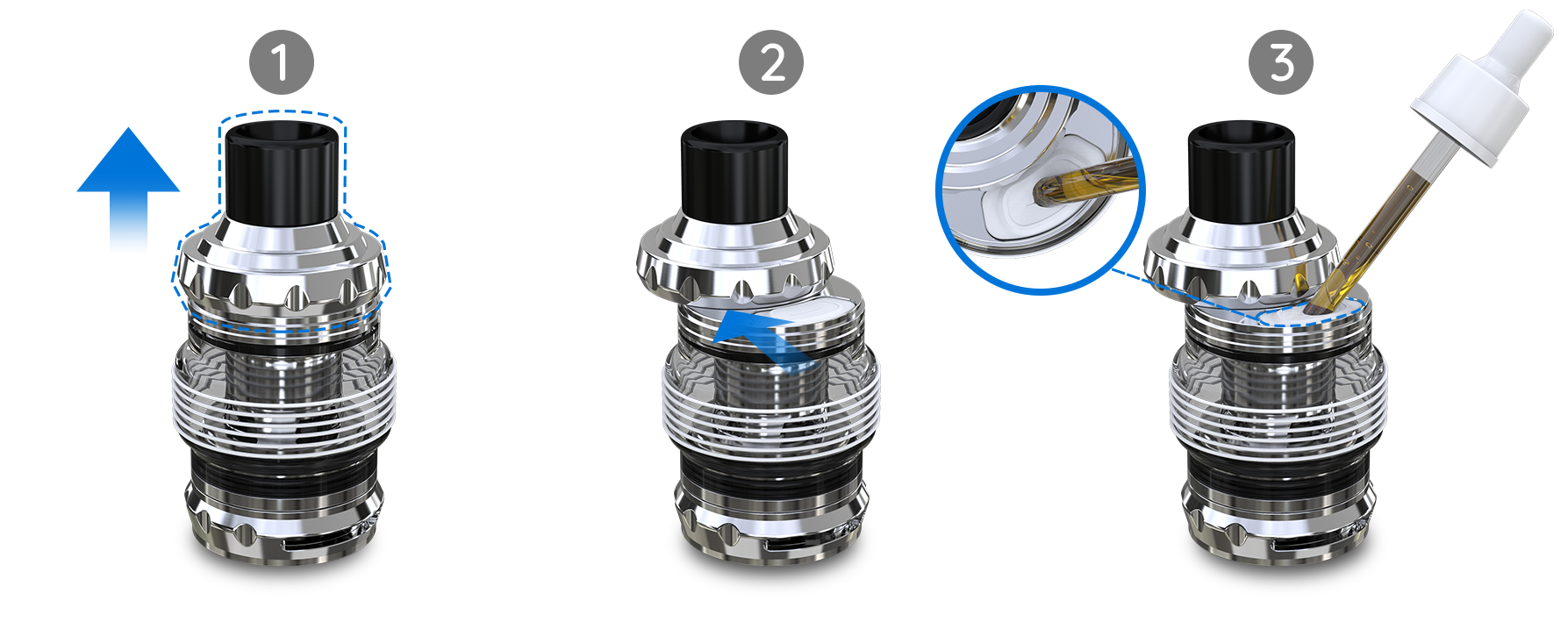 Per riempire il serbatoio, far scorrere semplicemente la parte superiore all'indietro per rivelare l'apertura di riempimento che rivela una membrana che ha la particolarità di prevenire perdite anche quando l'atomizzatore è aperto.