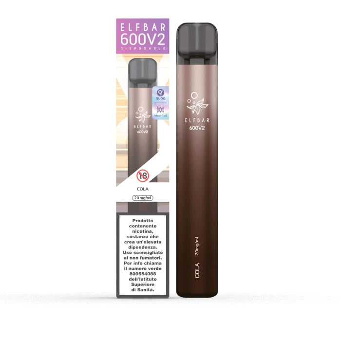 La Elf Bar 600 V2 Cola è una sigaretta elettronica usa e getta progettata per lo svapo di guancia (MTL), pre-caricata con 2ml di e-liquid al sapore di bibita alla cola, con sali di nicotina 20mg/ml.