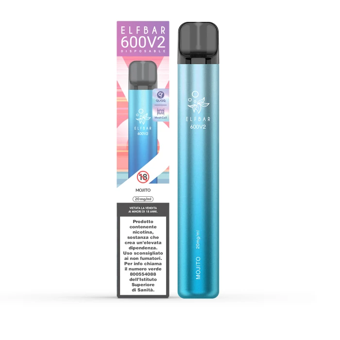 La Elf Bar 600 V2 Mojito è una sigaretta elettronica usa e getta progettata per lo svapo di guancia (MTL), pre-caricata con 2ml di e-liquid al sapore di mojito (rum, menta, lime, zucchero di canna e ghiaccio), con sali di nicotina 20mg/ml.