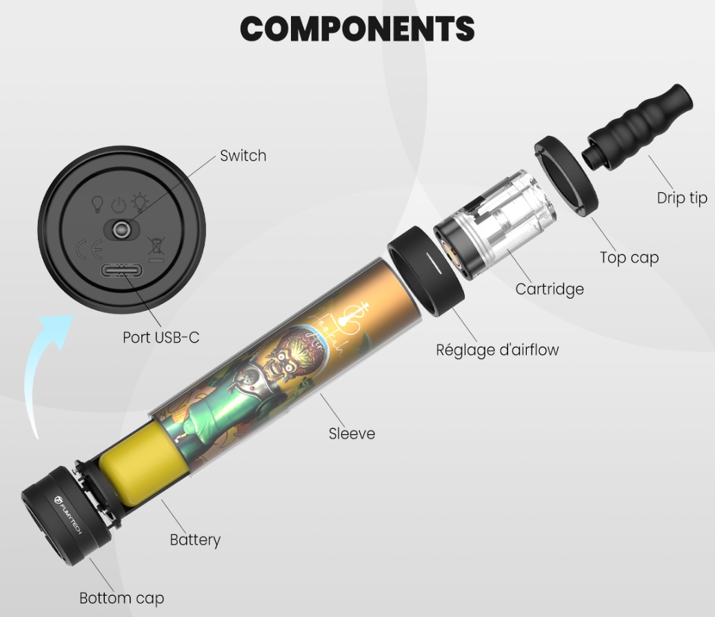 Fumytech presenta il "Narghilè" HOOKAH AIR! Questo dispositivo ha effetti luminosi, con l’integrazione di LED, e offre una potenza regolabile da 25 a 80 watt. Dotato di una batteria da 3200 mAh, si ricarica attraverso un connettore USB-C. La cartuccia ha una capienza di 6ml con sistema di riempimento laterale e include una resistenza Mesh, disponibile in diversi valori: 0,4ohm (45W), 0,3ohm (50W), e una cartuccia opzionale da 0,6ohm (30W). Con il pulsante Hookah Air, accendi o spegni il dispositivo, ed ha un flusso d’aria regolabile per un tiro DL. L’attivazione è automatica all’inalazione.