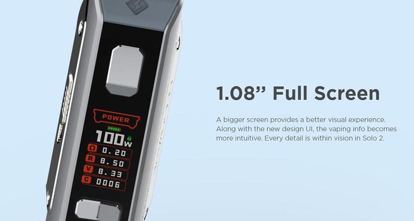 Per servirti al meglio, il kit Aegis Solo 2 Geek Vape offre un ampio schermo TFT a colori da 1,08 pollici che mostra le informazioni essenziali sul tuo vaporizzatore. Potenza, autonomia, resistenza installata, tutto è lì per uno svapo ben controllato!