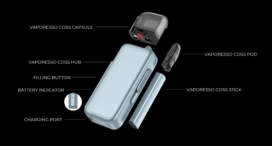 COSS Starter Kit di Vaporesso è una sigaretta elettronica per uno svapo da guancia. Si tratta della prima sigaretta elettronica con ricarica automatica di batteria e liquido tramite power bank
