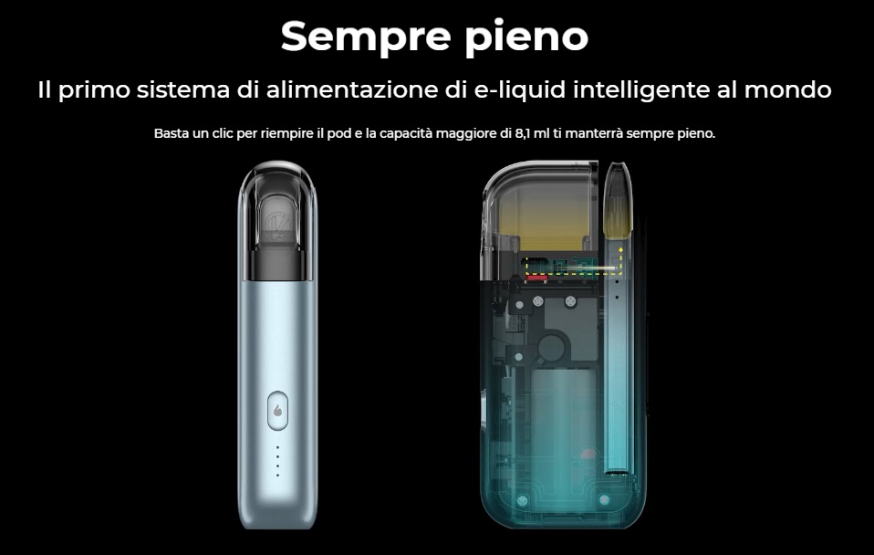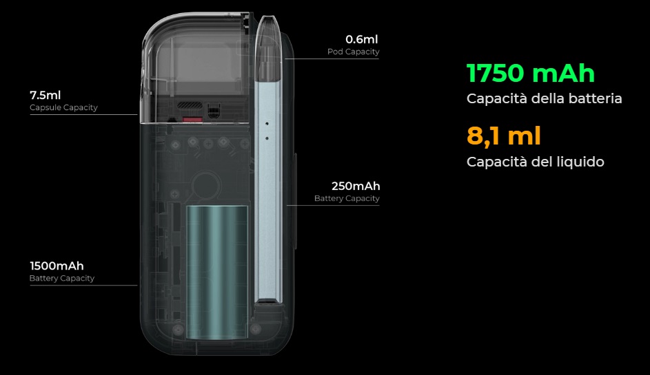 - Stazione di ricarica (hub): batteria integrata 1500mAh, serbatoio da 7,5ml in PCTG (sostituibile), sistema per tenere il liquido sottovuoto e refilare l'e-cig tramite pulsante quando viene alloggiata al suo interno.