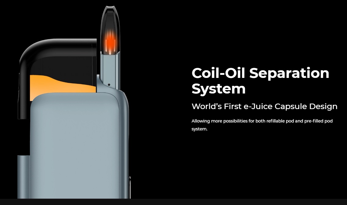 - Vape stick (pod mod): si connette magneticamente all'hub, ha una batteria indipendente da 250mAh e viene fornita con due cartucce con coil integrata da 1,2ohm e capacità 0,6ml (una pod con beccuccio piatto classico e uno che monta un drip tip in cotone).