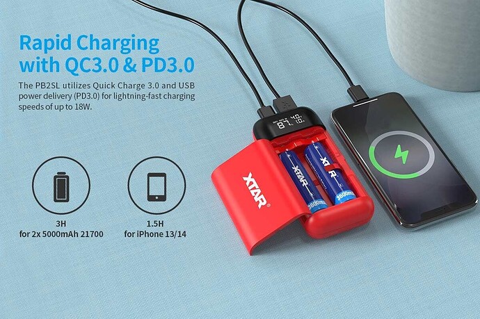 Il caricabatterie Xtar PB2SL è compatibile con i tre formati di batteria classici 18650, 20700 e 21700. Utilizza il protocollo di ricarica QC3.0 / PD 3.0 per consentire una corrente di carica massima di 2x2A in USB di tipo C con un adattatore da 9V compatibile . Il tuo miglior paio di batterie rivitalizzato in un attimo!