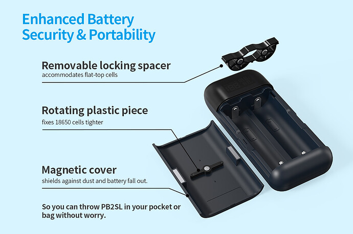 Basata su tutte le funzionalità di PB2S, questa nuova versione PB2SL può supportare batterie 20700/21700 protette. Come alcuni utenti hanno già fornito il feedback, lo spazio nel PB2S sembra un po' grande per le batterie 18650 durante l'uso. Quindi aggiungiamo un pezzo di plastica rotante, per mantenere le batterie 18650 in una posizione fissa. Inoltre, un distanziale di bloccaggio rimovibile è progettato anche per ospitare batterie flat-top.